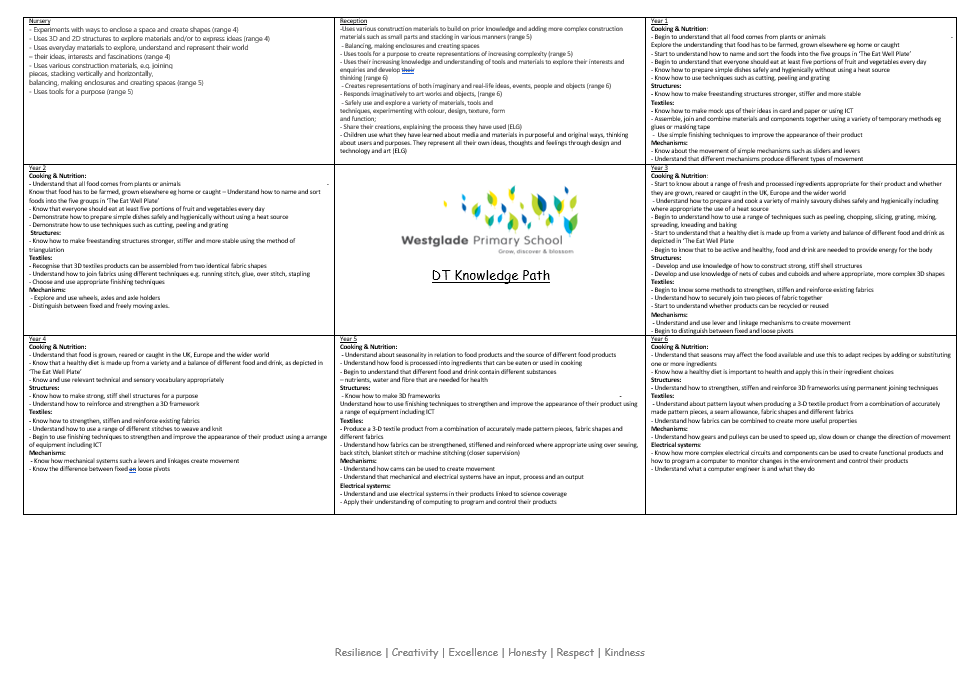 The DT knowledge path was created to map out the minimum level of knowledge our children should have in design and technology within each year group. To complement this, we developed a skills ladder for DT to show the progression from Nursery to Year 6, which demonstrates how our children’s skills will build from one year group to the next. Fundamentally, it has been the professional knowledge of our children that we have used to ensure that our DT curriculum is purposeful and is appropriate for all of our children, so that as our children progress, they should be able to combine their practical skills with an understanding of aesthetic, social and environmental issues, as well as of functions and industrial practices.
