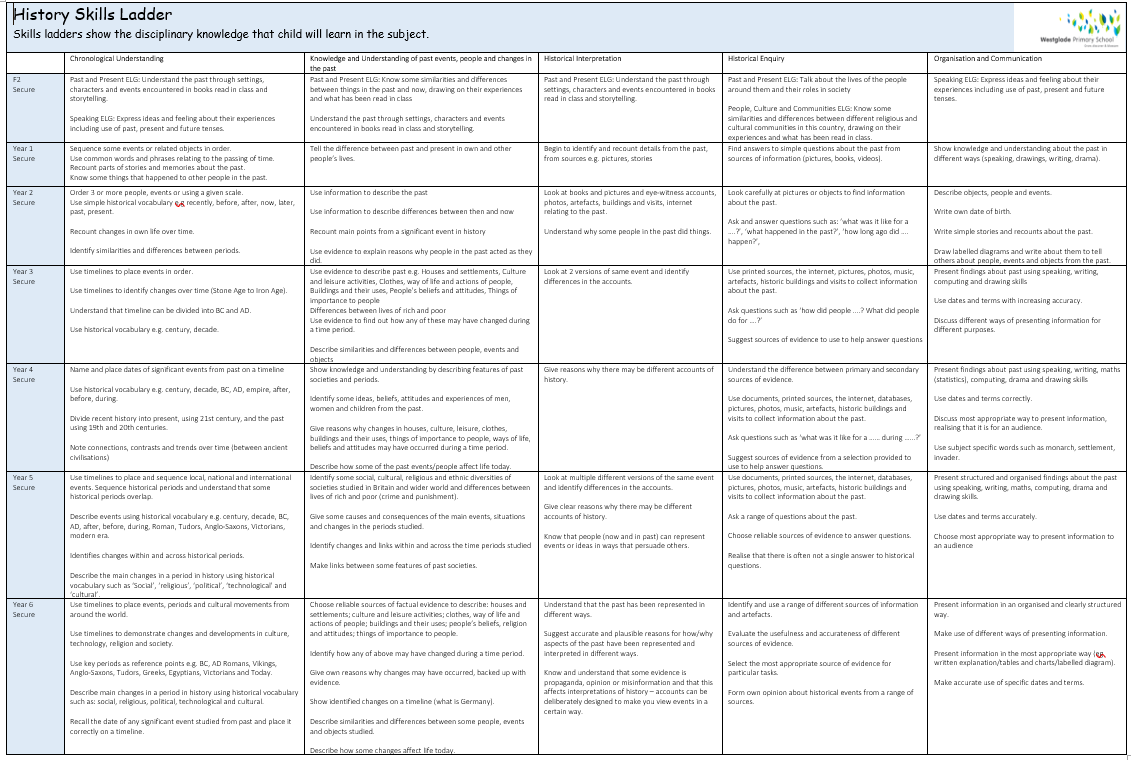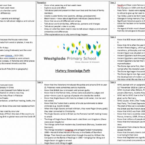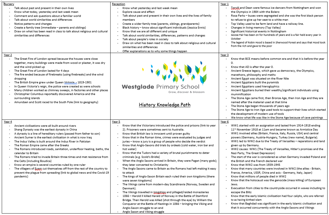 History at Westglade is taught from EYFS to Year 6, both through explicit History lessons, where children see themselves as Historians and also discreetly through cross-curricular activities. The children answer enquiry questions over a series of lessons. Flashbacks are used to ensure children are making changes to their long-term memory and provide the opportunities to apply and use substantive and disciplinary knowledge. We use a range of sources, including but not limited to: first-hand accounts, photographs, artefacts and other digital resources to further enhance their learning. Children are exposed to and learn a range of Historical vocabulary and are encouraged to use this across the curriculum to further embed knowledge.