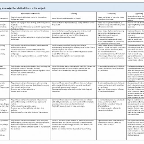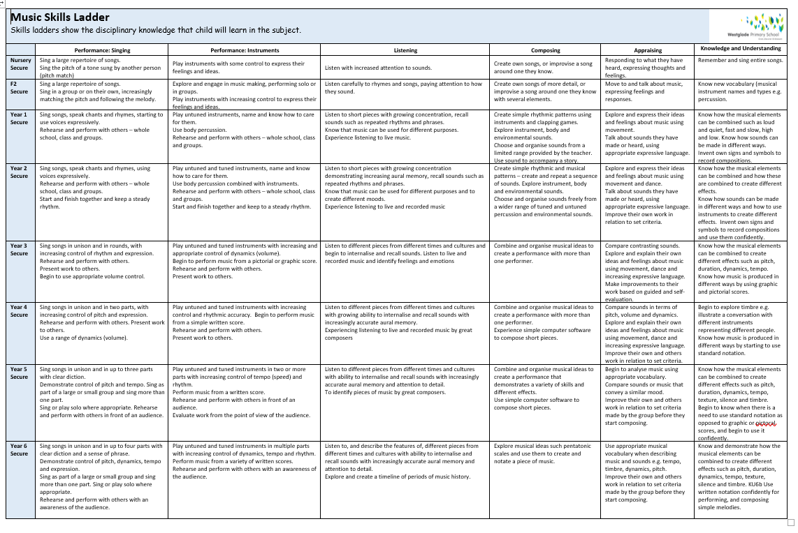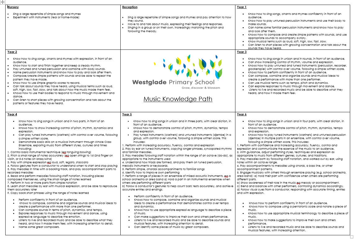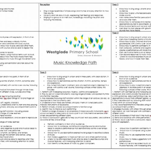To achieve our aims, the knowledge path was created to map out the minimum knowledge our children should have in music for each year group. The skills ladder demonstrates how children's skills will build from one year to the next. Our secure professional knowledge of the children underpins our curriculum making it meaningful and appropriate for all children. As children progress, they think more in depth and have a deeper understanding of music.