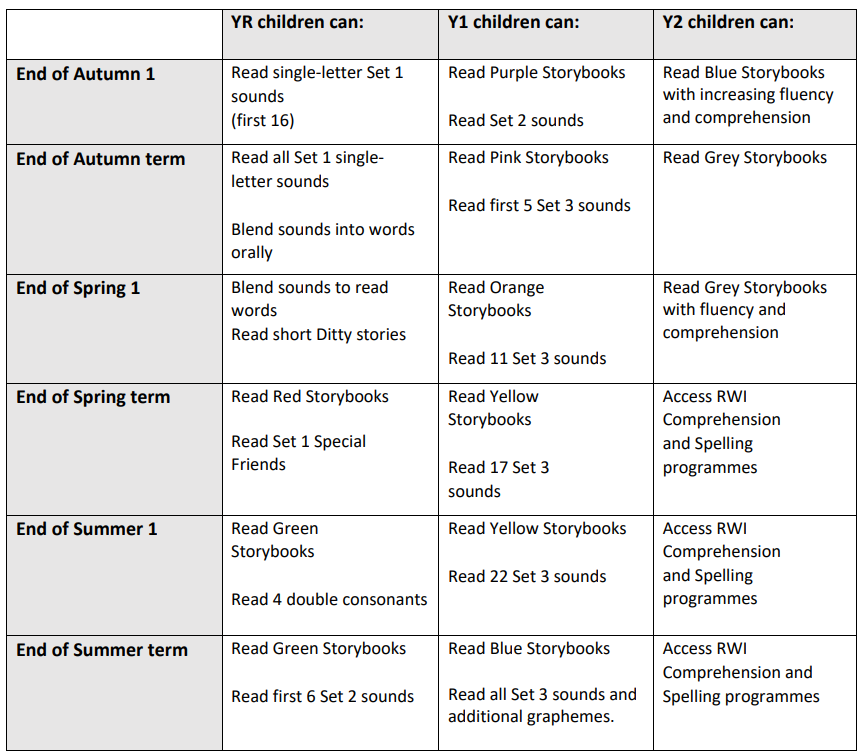 When children move into F2 they join the main RWI programme and are streamed alongside other classes based on their individual reading needs. Each half term children are assessed and moved accordingly.