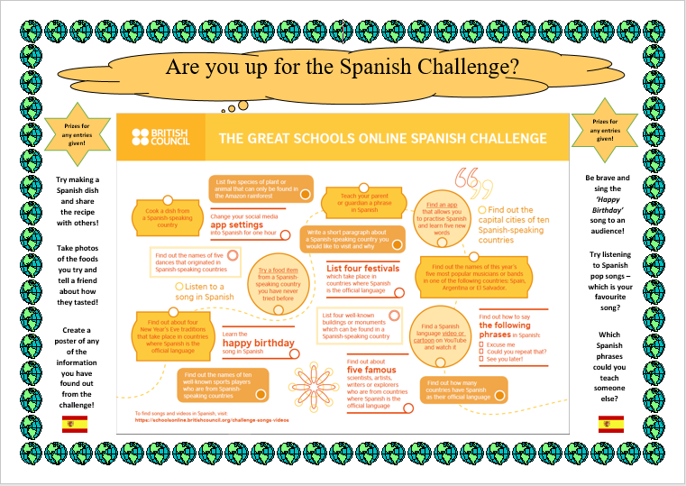 You have been working so hard at learning Spanish this year and I hope these resources will help you to keep up with your learning. Have a go at learning some of the songs, try some of the activities that you can do and have a go with your family at some of the challenges from the Spanish Online Learning Challenge that you didn’t manage to try out! Take photos if you can, so you can keep a visual record of tasks you have completed.